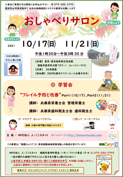 2021年10月13日 by 人・こころネット スタッフ 10月、11月おしゃべりサロンのお知らせ こんにちは、人・こころネットです☺💐皆さまいかがお過ごしでしょうか🏡 10月17日(日)、11月21日(日)おしゃべりサロンの開催をお知らせします☕💕10月、11月の2回にわたり、管理栄養士、歯科衛生士による学習会、“フレイル予防と改善”を開催👩🏫✨皆さまのご参加を心よりお待ちしております🌹👴🧓👩🦰👨🦰🌹 今回も新型コロナウィルス予防のため、ソーシャルディスタンス、マスクの着用などご協力をよろしくお願いいたします🙇 Facebook で共有するにはクリックしてください (新しいウィンドウで開きます) Facebook クリックして友達にメールでリンクを送信 (新しいウィンドウで開きます) メールアドレス クリックして印刷 (新しいウィンドウで開きます) 印刷 関連