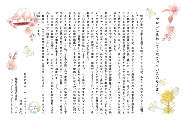 そこで、次年度のサロンはみなさまに安心して参加いただけるよう、楽しんで交流していただけるよう、ボランティアさんとスタッフが一生懸命対応いたします。そのため、無理なく準備・開催ができるように、5月スタート、奇数月に開催する予定にいたしました。