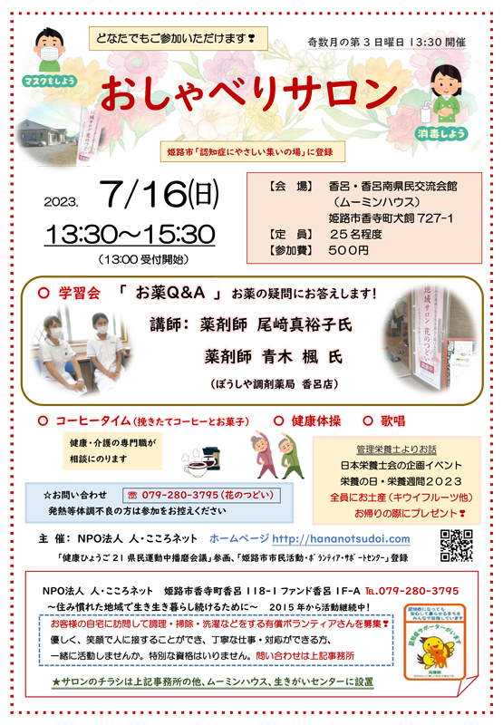 2023年6月26日 by 人・こころネット スタッフ 7月おしゃべりサロンのお知らせ こんにちは、人・こころネットです😊🍀皆さまいかがお過ごしでしょうか☕💕 7月おしゃべりサロンのお知らせです📝会場では手指消毒やマスク着用、検温など、コロナ対策の上実施を予定しております🤒皆さまのご参加を心よりお待ちしております🙇ご参加される方はお気をつけてお越しくださいませ😊 尚、新型コロナウィルス感染状況により、延期または中止となる場合がございます💁開催が変更となる場合はこちらのページでもお知らせしますので、よろしくお願いいたします🙇 Facebook で共有するにはクリックしてください (新しいウィンドウで開きます) Facebook クリックして友達にメールでリンクを送信 (新しいウィンドウで開きます) メールアドレス クリックして印刷 (新しいウィンドウで開きます) 印刷 関連