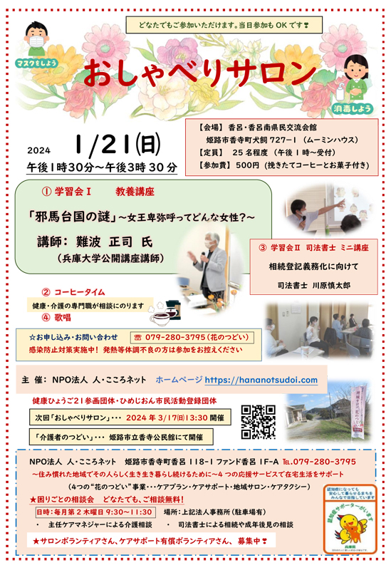 2023年12月9日 by 人・こころネット スタッフ 1月おしゃべりサロンのお知らせ こんにちは、人・こころネットです😊🍀皆さまいかがお過ごしでしょうか☕💕 2024年1月21日(日)おしゃべりサロンのお知らせです📝今回の学習会は教養講座『邪馬台国の謎 ~女王卑弥呼ってどんな女性?~』、講師は兵庫大学公開講座講師の難波 正司氏です🧑💼💡皆さまのご参加を心よりお待ちしております🙇ご参加される方はお気をつけてお越しくださいませ😊🍀 Facebook で共有するにはクリックしてください (新しいウィンドウで開きます) Facebook クリックして友達にメールでリンクを送信 (新しいウィンドウで開きます) メールアドレス クリックして印刷 (新しいウィンドウで開きます) 印刷 関連