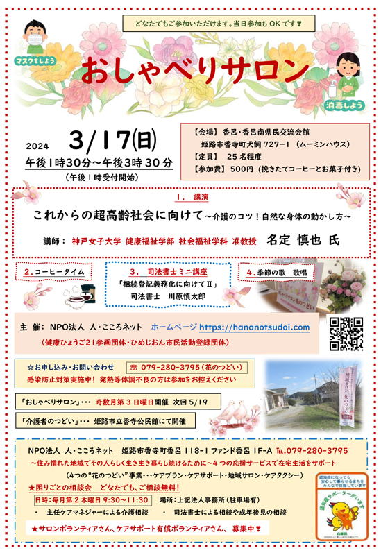2024年3月3日 by 人・こころネット スタッフ 3月おしゃべりサロンのお知らせ こんにちは、人・こころネットです😊🍀皆さまいかがお過ごしでしょうか☕💕 3月17日(日)おしゃべりサロンのお知らせです📝今回の学習会は『これからの超高齢社会に向けて~介護のコツ!自然な身体の動かし方~』、講師は神戸女子大学 健康福祉学部 社会福祉学科 准教授 名定 慎也氏です🧑💼💡 皆さまのご参加を心よりお待ちしております🙇ご参加される方はお気をつけてお越しくださいませ😊🍀 Facebook で共有するにはクリックしてください (新しいウィンドウで開きます) Facebook クリックして友達にメールでリンクを送信 (新しいウィンドウで開きます) メールアドレス クリックして印刷 (新しいウィンドウで開きます) 印刷 関連