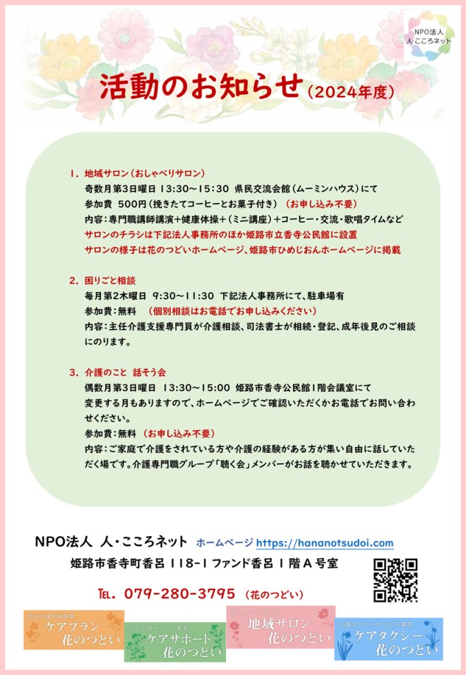 2024年6月13日 by 人・こころネット スタッフ 2024年度 活動のお知らせ こんにちは、人・こころネットです。今年度の活動のお知らせを掲載します。皆さまのお越しを心よりお待ちしております。 Facebook で共有するにはクリックしてください (新しいウィンドウで開きます) Facebook クリックして友達にメールでリンクを送信 (新しいウィンドウで開きます) メールアドレス クリックして印刷 (新しいウィンドウで開きます) 印刷 関連