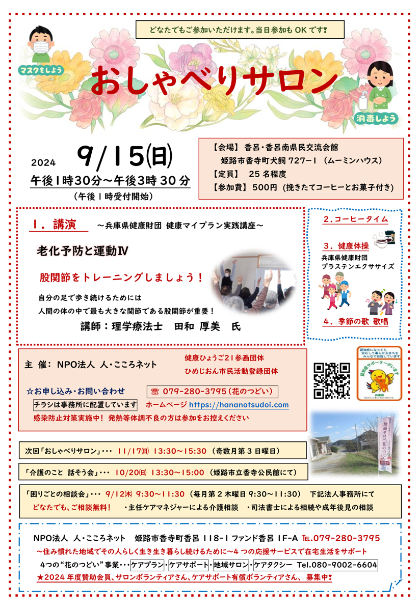 2024年9月2日 by 人・こころネット スタッフ 9月おしゃべりサロンのお知らせ こんにちは、人・こころネットです😊🍀皆さまいかがお過ごしでしょうか☕💕 9月15日(日)おしゃべりサロンのお知らせです📝今回の学習会は『老化予防と運動Ⅳ』、講師は理学療法士 田和 厚美 氏です💁 皆さまのご参加を心よりお待ちしております🙇ご参加される方はお気をつけてお越しくださいませ😊🍀 Facebook で共有するにはクリックしてください (新しいウィンドウで開きます) Facebook クリックして友達にメールでリンクを送信 (新しいウィンドウで開きます) メールアドレス クリックして印刷 (新しいウィンドウで開きます) 印刷 関連