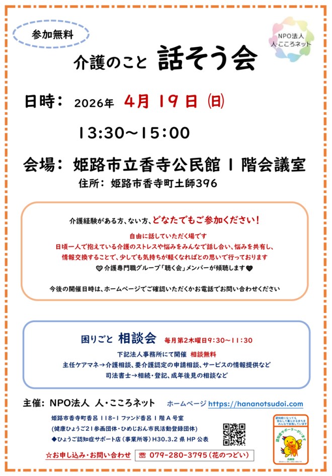 2026年4月7日 by 人・こころネット スタッフ 4月「話そう会」開催のお知らせ 4月19日(日)に介護のこと 話そう会を開催します。下の画像をタップまたはクリックしていただくと、詳細をご覧いただけます。皆さまのご参加をお待ちしております。 日時:4月19日(日) 13時30分~15時会場:姫路市立香寺公民館 1階会議室 Facebook で共有 (新しいウィンドウで開きます) Facebook 友達にメールでリンクを送信 (新しいウィンドウで開きます) メールアドレス 印刷 (新しいウィンドウで開きます) 印刷 関連